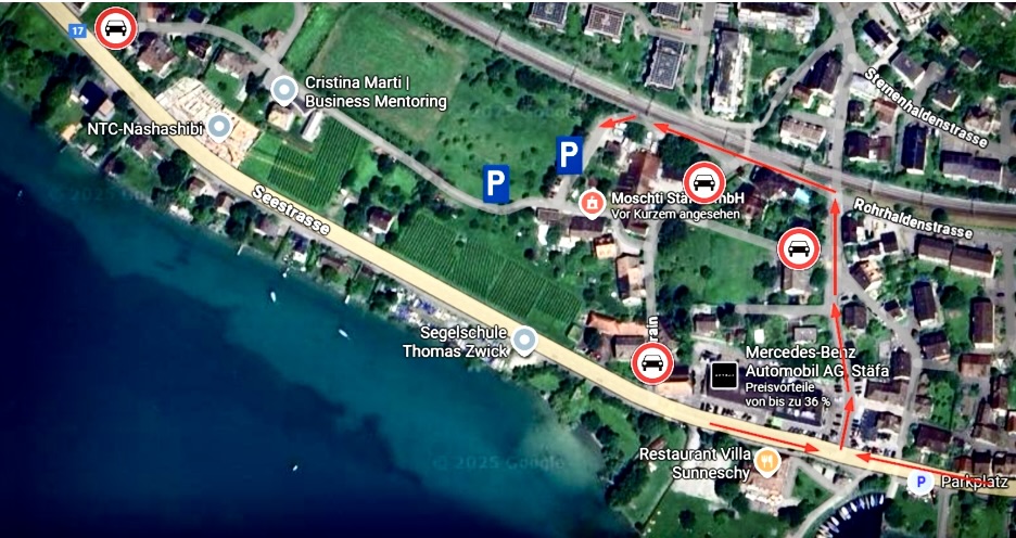 Fahren Sie auf der Seestrasse in Richtung Rapperswil. Biegen Sie bei der Veloteria nicht ab, sondern fahren Sie geradeaus weiter und passieren Sie das Restaurant Villa Sunneschy. Bei der Skoda-Garage biegen Sie links in die Ebnetstrasse ein. Unmittelbar vor der Bahnunterführung biegen Sie erneut links ab und folgen den Markierungen bis zur Moschti. Bitte beachten Sie die Beschilderungen vor Ort und verlassen Sie sich nicht auf das Navigationssystem.